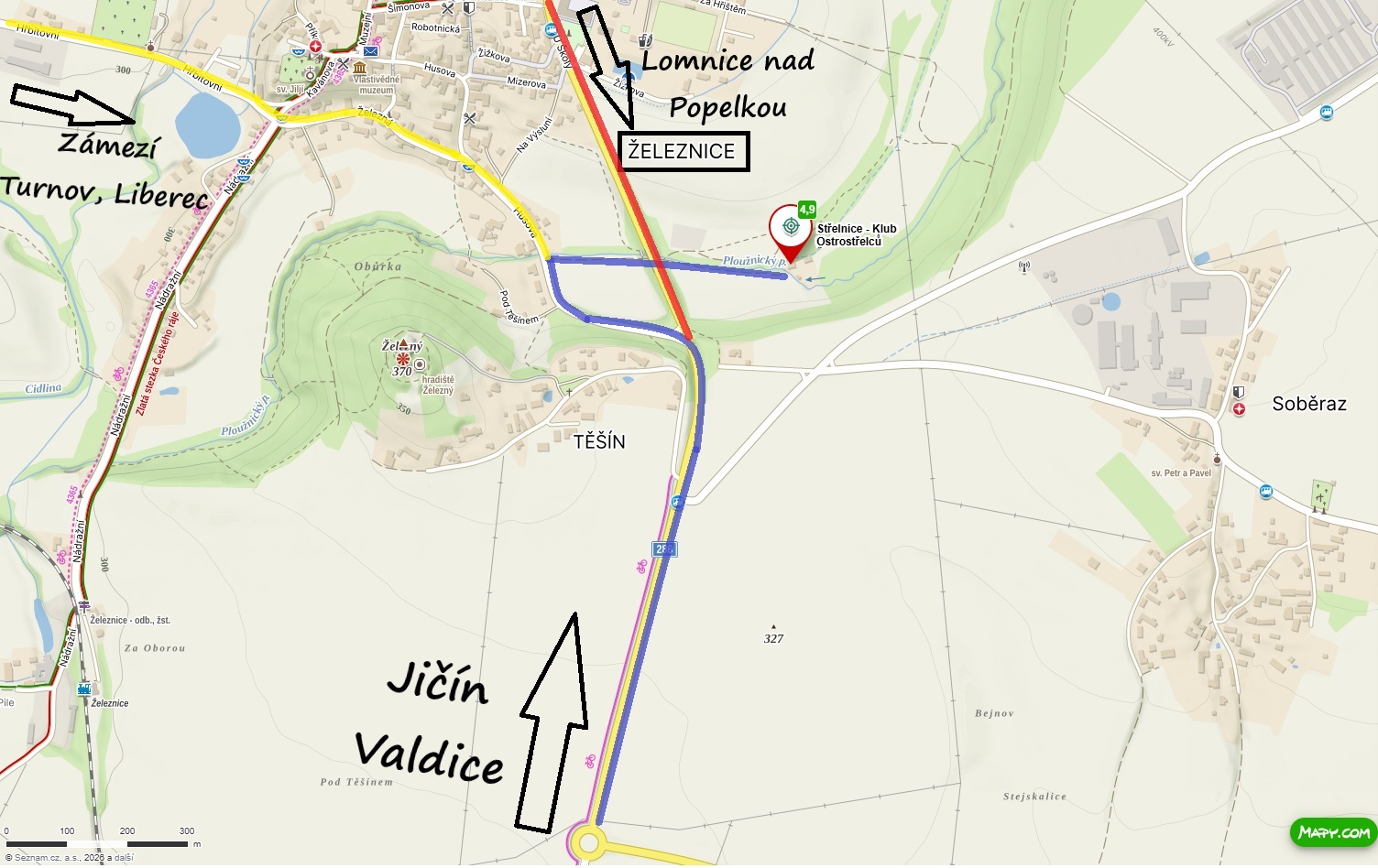 Vyznačená cesta ke střelnici ve směru od Jičína - fialová. Opačný směr přes Železnici je od Lomnice nad Popelkou - Červená. Případně se dá přijet i od Zámezí (směr Turnov/Liberec) - žlutá, ale s ohledem na stav silnic v tomto směru bych možná doporučil i těmto lidem jet přes Jičín...
